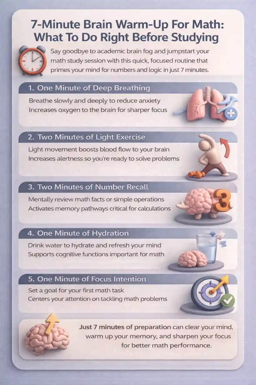 This page explains exactly what to do in the 7 minutes right before a math study session, complementing habits like regular reading. The routine is fast, equipment-free, and built around how the brain performs best during analytical tasks—helping students study more efficiently and get better results with less mental strain.